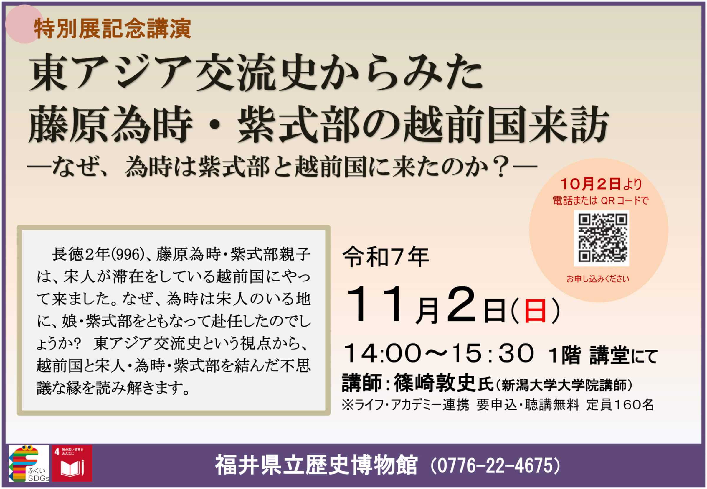 福井県立歴史博物館 特別展「越前・若狭 異国との出会い」記念講演「東アジア交流史からみた藤原為時・紫式部の越前国来訪」を開催します